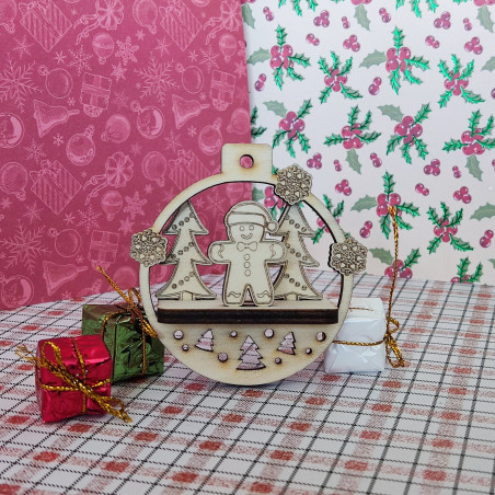 Ajoutez une touche artisanale et festive à votre sapin avec cette jolie suspension en bois gravé. Représentant un Bonhomme de pain d'épices joyeux avec des sapins décorés, ce charmant ornement est parfait pour une décoration traditionnelle et chaleureuse.